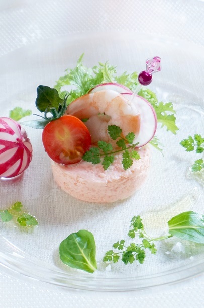 クリームチーズに明太子を混ぜセルクルに程よい高さに詰めたら、お皿に抜き出しお好みの野菜や具をバランスよくトッピングします。